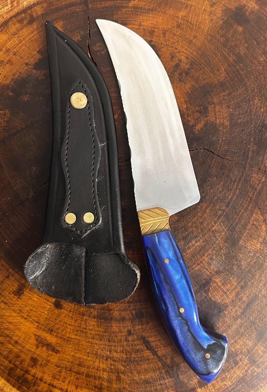 Faca Artesanal Utilitária skinner para uso diário, cortes rápidos excelente fio de corte, alta precisão e manuseio fácil. Pomo com furo e fios de couro ideal para vaquejada e rodeio ou presente especial. Produtos do Gaúcho — tradição e qualidade em cutelaria.